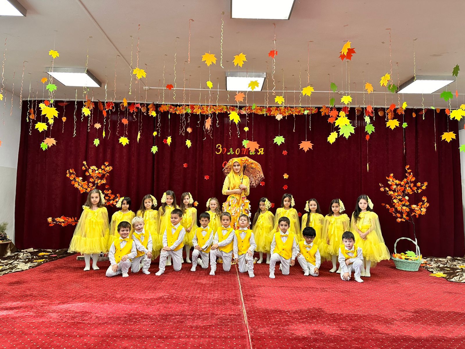 Зал оформлен в осенних тонах, также на обозрение выставлены творческие работы родителей из материала. В этом году утренники проводились во всех возрастных группах кроме первой младшей группы.